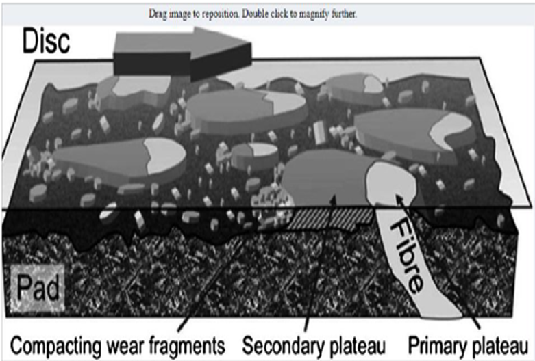 Picture is the illustration of the contact situation between the pad and disc. A transparent disc is moving from left to right. Some of the wear particles pile up against the contact plateaus and create secondary plateaus. A flow of wear particles in the gap between the pad and disc wear the lowlands of the pad through three-body abrasion .